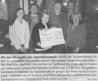 Donnerstag 19.05.2005 / 21:00 - Alexander Stöger Nichts neues im Osten! So lauten zur Zeit die Meldungen. Dafür laufen die Spendenaktionen auf hochtouren, und in Gänserndorf konnte das "werbe-team" (Zusammenschluß der Geschäftsleute in Gänserndorf) eine großartige Spendensumme einfahren. Siehe Artikel des NÖ-Anzeigers: